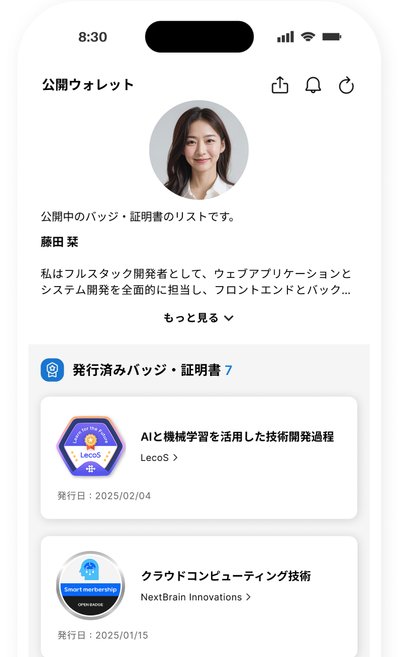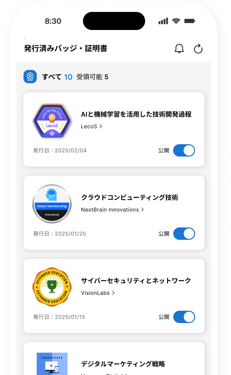 国際標準規格OpenBadge2.0で作られたオープンバッジでしたら、発行元がどちらの企業や資格団体でも1つのオープンバッジウォレットで管理ができます。